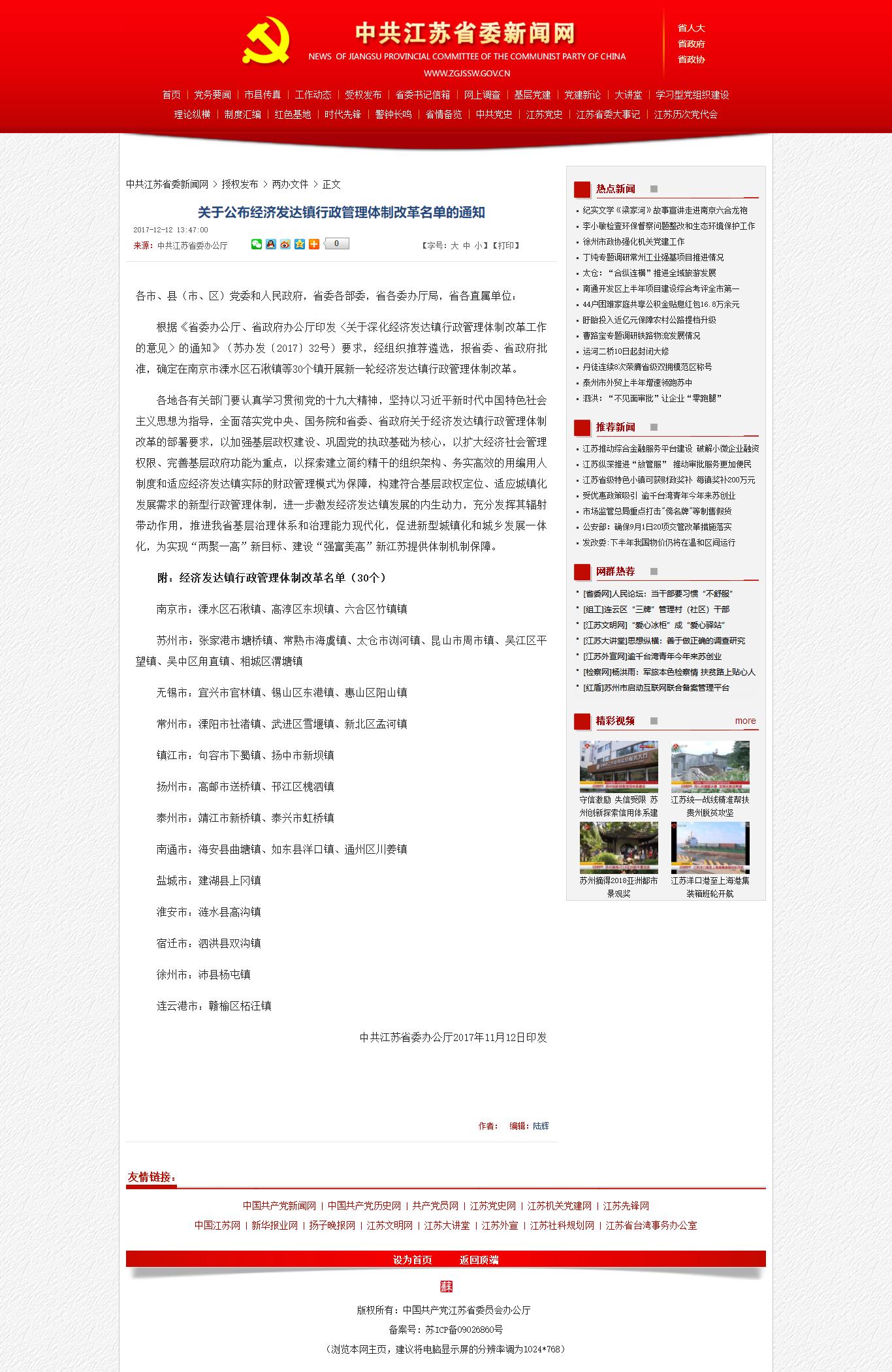 江蘇省《關(guān)于公布經(jīng)濟(jì)發(fā)達(dá)鎮(zhèn)行政管理體制改革名單的通知》